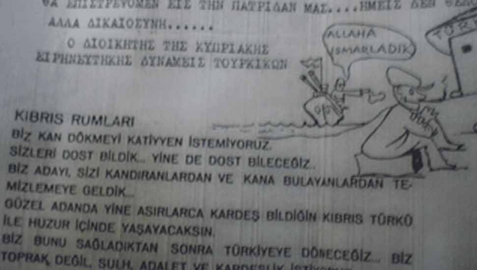 Bugünkü yazımda yayınlıyorum. Broşürün bir tanesinde " Kıbrıs Rumları. Ada Türkleri ile beraber kardeşçe yaşamanız için çok uğraştık ve sabrettik. Kıbrıs ve yunan idarecileri sizi birbirinize düşürdüler. Boş yere kan döktürdüler. Hür vatanınızı Enosis denen boyunduruk altına sokmak istediler. Siz de idarecilerinize artık yeter demesini biliniz" Kıbrıs Türk barış kuvvetleri komutanı…