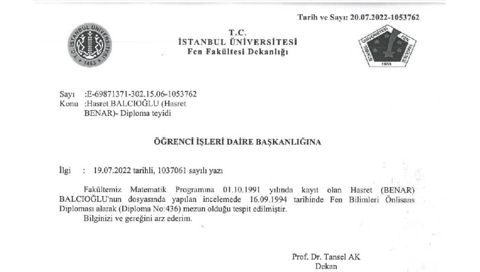İstanbul Üniversitesi’nin 2 yıllık Fen Bilimleri ön lisans programından mezun olduğu resmi belge ile ispatlandı!