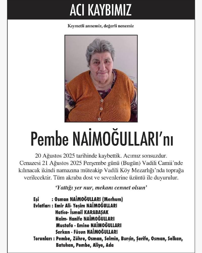 Naimoğulları, yarın Vadili Camisi’nde kılınacak ikindi namazına müteakip Vadili Köy Mezarlığı’nda son yolculuğuna uğurlanacak.