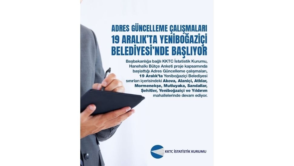 Başbakanlığa bağlı İstatistik Kurumu, Hanehalkı Bütçe Anketi projesi kapsamında adres güncelleme çalışmalarını bugünden itibaren Yeniboğaziçi Belediyesi sınırları içindeki dokuz köyde yürütecek.