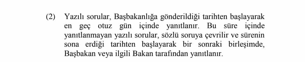 Yasaya göre, yazılı soruların Başbakanlık’a gönderildiği tarihten başlayarak en geç otuz gün içinde yanıtlanması gerekiyor. Bu süre içinde yanıtlanmayan yazılı sorular, sözlü soruya çevriliyor ve sürenin sona erdiği tarihten başlayarak bir sonraki birleşimde Başbakan veya ilgili Bakan tarafından yanıtlanıyor.