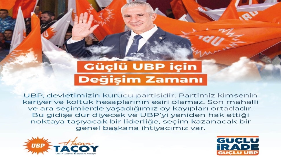 UBP Genel Başkan Adayı Hasan Taçoy, "UBP’nin yeniden güçlü bir liderlik etrafında birleşmesi, partimizin tek başına iktidar olabilecek bir yapıya kavuşması zorunluluk halini almıştır" ifadelerini kullandı.
