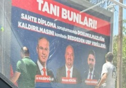 Halkın Partisi (HP) tarafından sahte diploma meselesi ile ilgili olarak dokunulmazlığın kaldırılmasına hayır oyu vererek engelleyen UBP milletvekillerini kamuoyuna duyuran ve daha sonra yırtılıp parçalanan Billboard afişleri bugün yenilenerek yeniden asıldı.