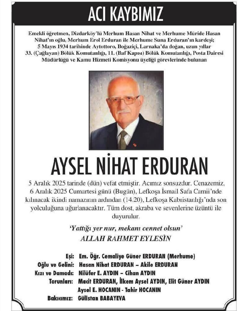 Aysel Nihat Erduran, yarın İsmail Safa Camisi'nde kılınacak ikindi namazının ardından Lefkoşa Mezarlığı'nda toprağa verilecek.