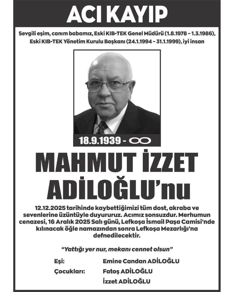 Mahmut İzzet Adiloğlu, 16 Aralık Salı günü Lefkoşa İsmail Safa Camisi’nde kılınacak öğle namazının ardından Lefkoşa Mezarlığı’nda defnedilecek.