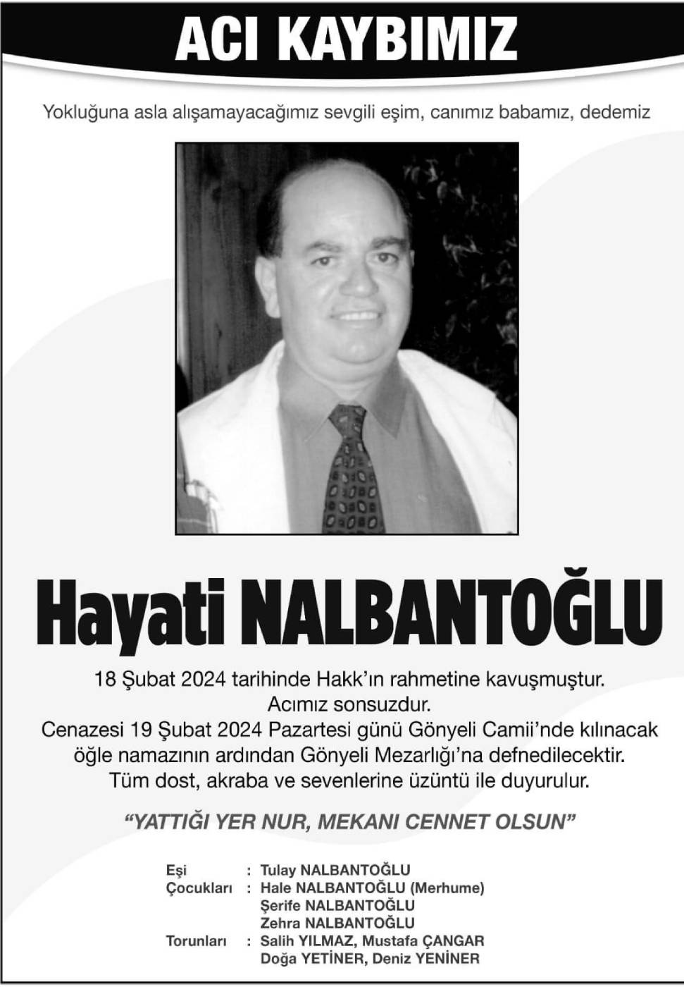 Ulusal Birlik Partisi (UBP) Gönyeli Kadın Kolları Başkanı Tülay Nalbantoğlu'nun eşi Hayati Nalbantoğlu yaşamını yitirdi.